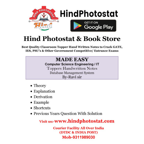 They are sourced from current student. They are very well written in clear hand writing and print quality is awesome.-This booklet is useful for Gate, PSU Exams.-These notes are handwritten notes of MADE EASY coaching in New Delhi.-This booklet contains topics related to Data Base Management System